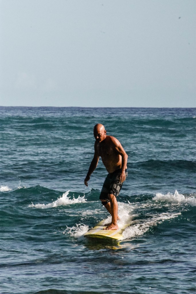 The statue of Duke Kahanamoku, Native Hawaiian surfer stands proudly behind us.