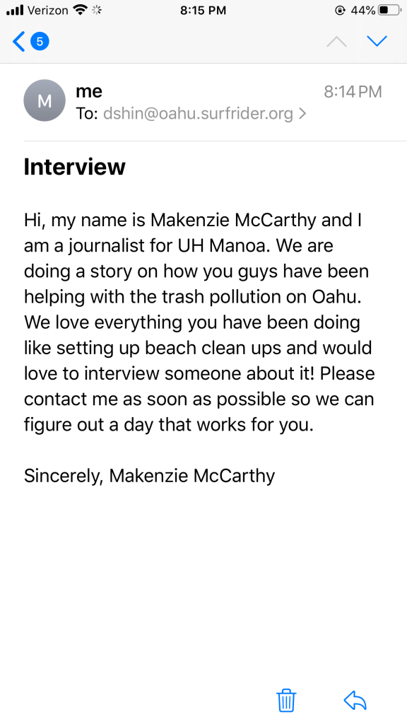 Reflection: I found reaching out to sources to be relatively easy and I think I will be going with the beach trash story. I read the article about the name of the dog and found it super interesting. This taught me to ask a subject a lot of questions so that when I look back at my notes all the information is there. Some facts can be super important and draw the audience in further.
